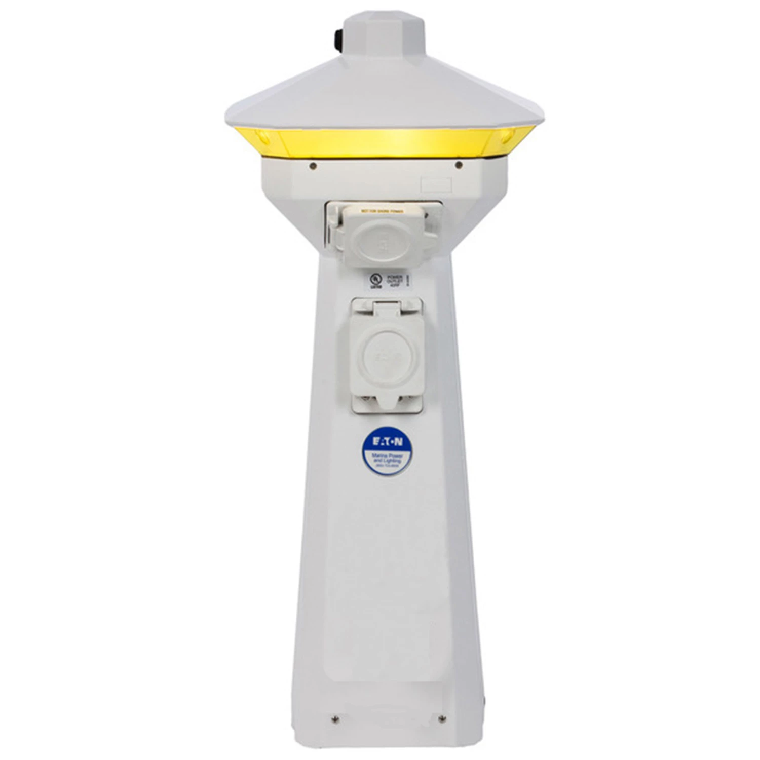The EATON Hatteras Power Pedestal Light is an elegant and low cost solution for your shore power needs. This powerful yet compact pedestal is perfect for providing shore power connections to residential boaters or docks with limited space. Perfect for walkway lighting, decks, pools, and smaller boating applications. Standard features: white heavy resin housing with an acrylic polymer coating for a UV resistant finish, copper bus, Eaton circuit breaker protection for all receptacles and lighting, NEMA 3R rating, UL Listed, and meets electrical code requirement for shore power access.