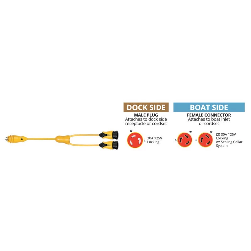 The EEL™ (Easily Engaged Lock) ShorePower Pigtail Adapter has the same jaw-clamp design as the EEL ShorePower™ cordsets and offers a secure, waterproof seal. This “Y” adapter splits a single 30A shore power service into two 30A applications. A built in light in the center of each female (boat side) connector makes hooking up to shore power at night easy. LED power indicator lights at both ends confirm that power is running through the adapter and serve as an alert that the cord is plugged into the shore side power source. Because these “Y” adapters feature the EEL jaw-clamp design, they can be used in wet environments. Included sealing collar provides watertight seal when connecting to two shore power cords to create a longer cord.