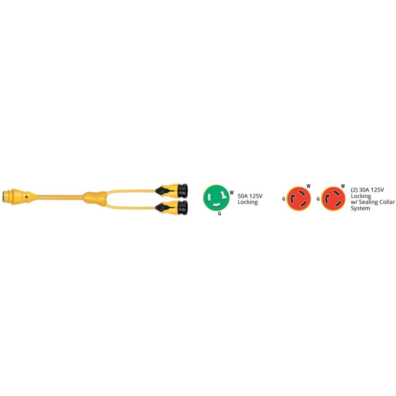 Two 30A boat side female connectors allow you to split the output of one 50A dockside receptacle.