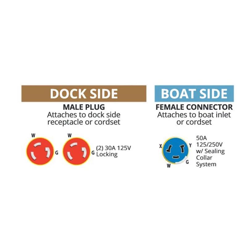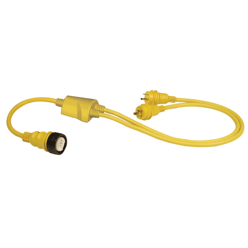 A reverse Y adapter allows you to draw 125V/250V AC current from two 30A outlets. To protect against shock hazard and reverse polarity, a special circuit does not allow current to flow until both plugs are connected properly. This keeps an unplugged plug from being “hot” due to the other plug being energized. The plugs are fully molded and come with sealing collars for use in wet environments.Â