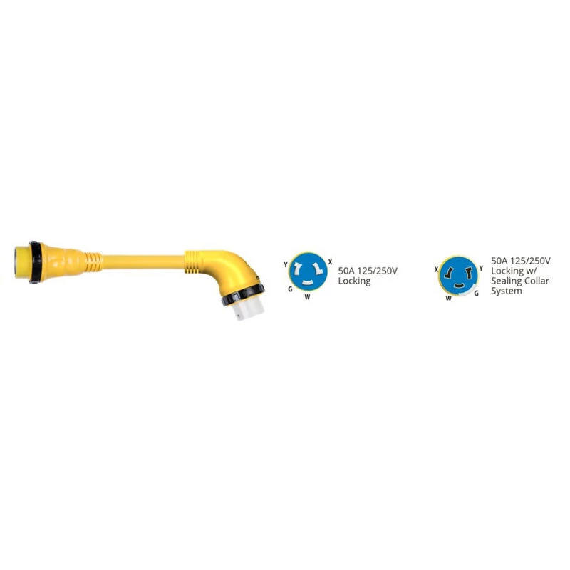 The MARINCO 50A Right-Angle Cord Set Adapter is used when space is tight, convert your existing shore power cordset from a straight connection to a right angle connection. GripLock™ handle design for easy hook-up and correct blade alignment, even in the dark. Includes sealing collar to lock out moisture between adapter and cordset.