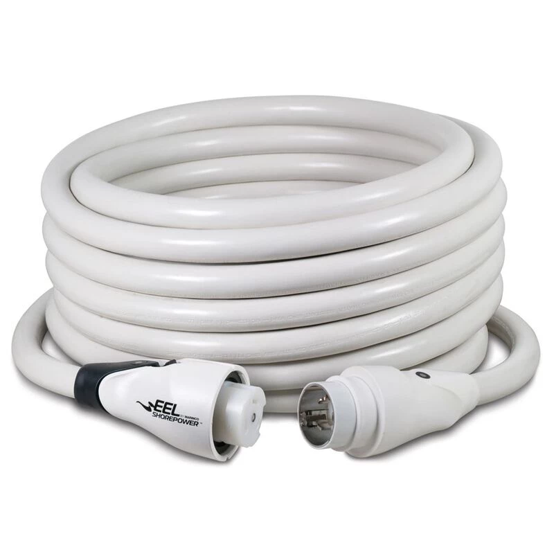 The EEL™ (Easily Engaged Lock) ShorePower Cordset has a jaw-clamp design that offers one-handed operation. Simply squeeze the wings, align and insert into your boat’s existing inlet then release and rotate to create a secure, waterproof seal. A built in light in the center of the female (boat side) connector makes connecting to shorepower at night easy. LED power indicator lights at both ends confirm that power is running through the cord and serve as an alert that the cord is plugged into the shore side power source.