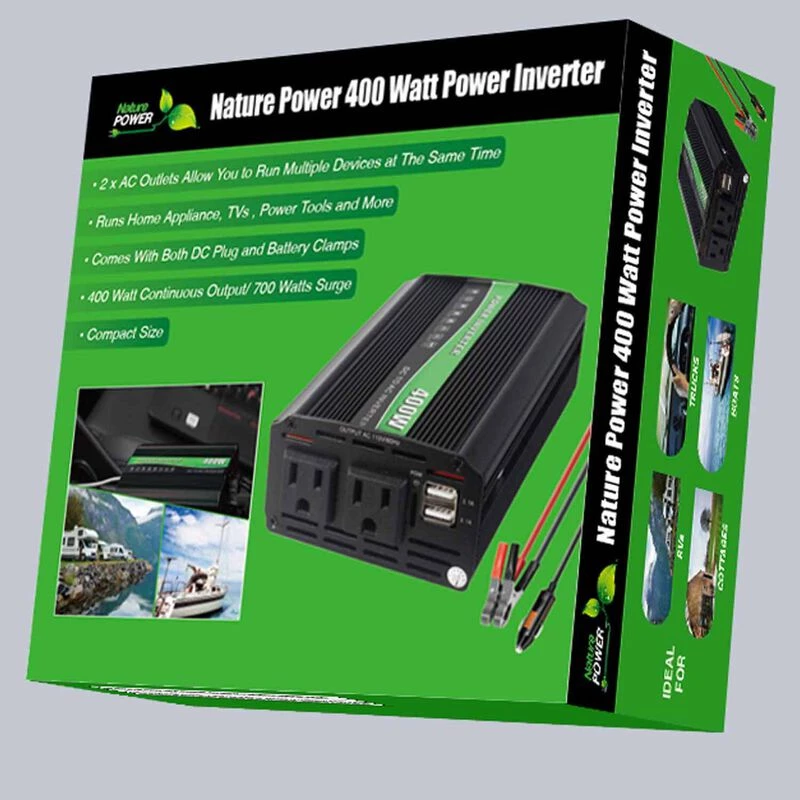 Nature Power’s 400 Watt Power Inverter offers 400 Watt Continuous Output/700 Watt Surge. Ideal for RV’s, Boats, Trucks, and Cabins. Easily convert battery power to household AC power.
