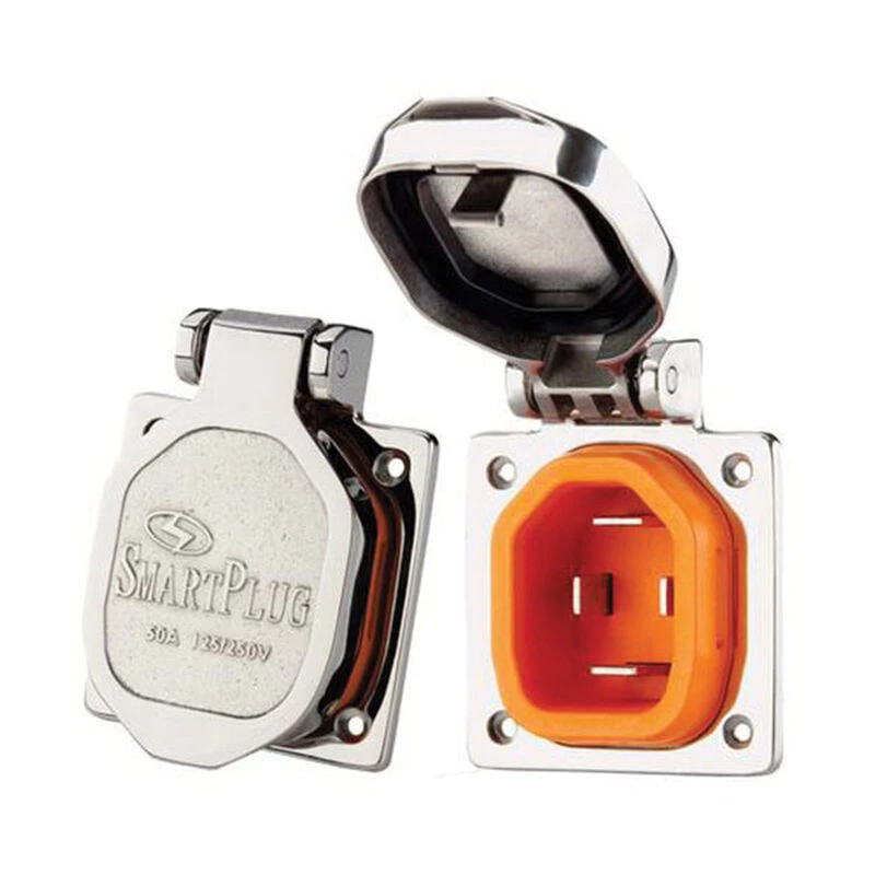 The SmartPlug 50 Amp Stainless Steel Inlet is easily retrofitted to the existing four-hole pattern and footprint of the traditional twist type inlet. The Inlet cap and flange are made of Grade 316 stainless steel and also have multiple locking points to ensure the plug is safe and secure.